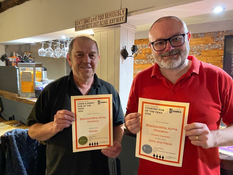 Anthony from The Blacksmiths Arms in Mickleton receiving his two certificates from Pubs Officer Pete Fenwick: